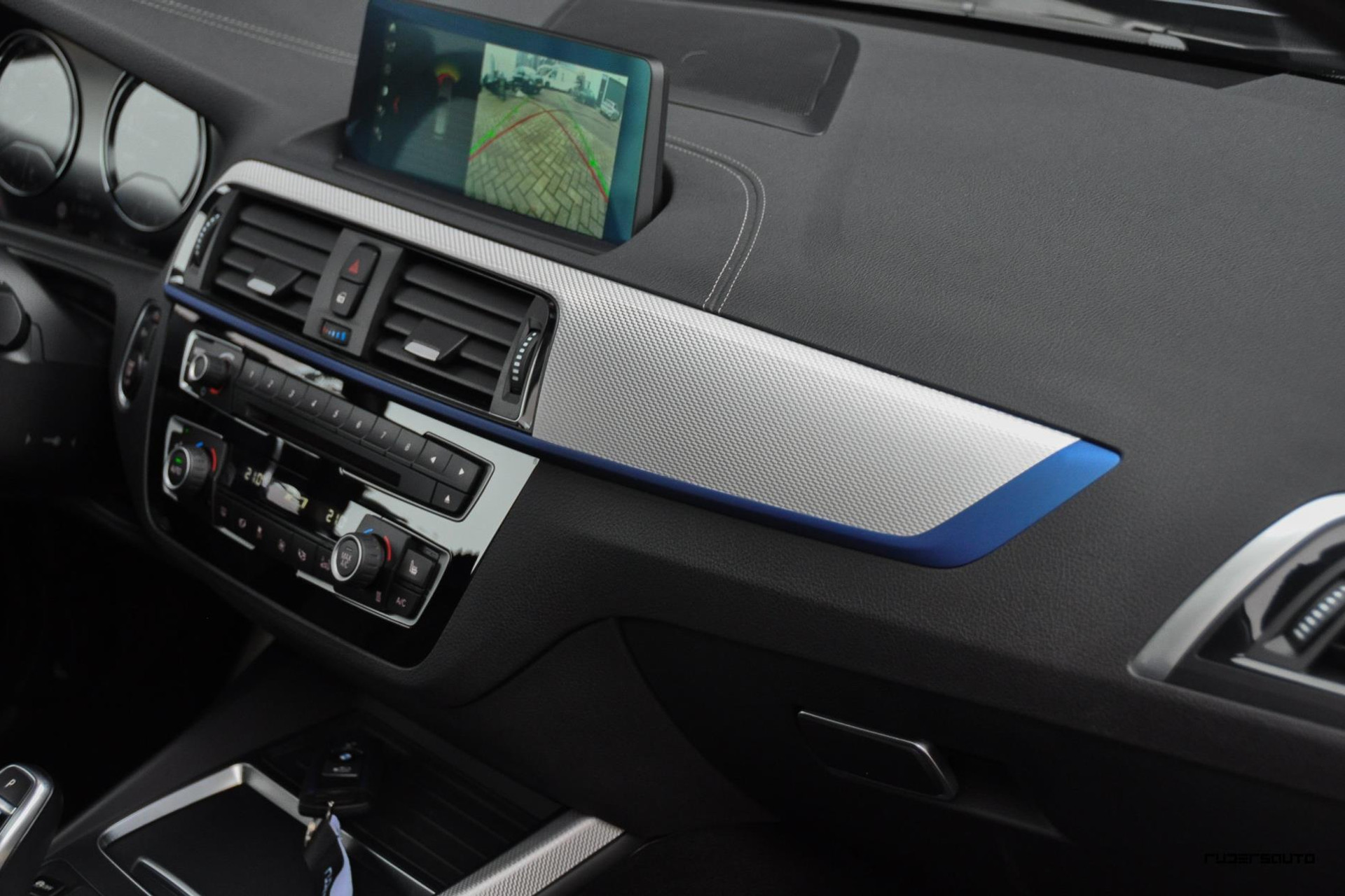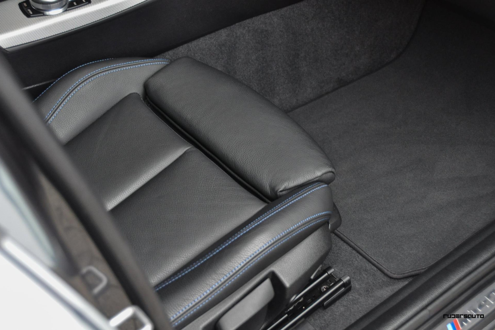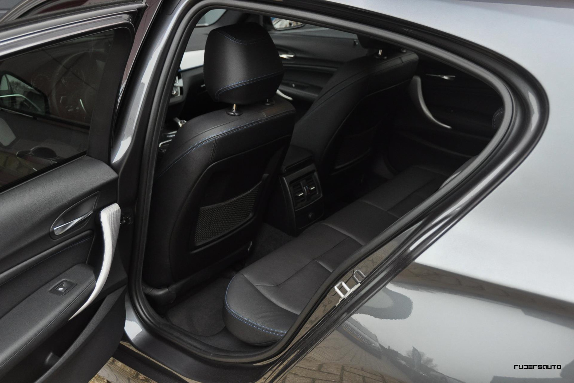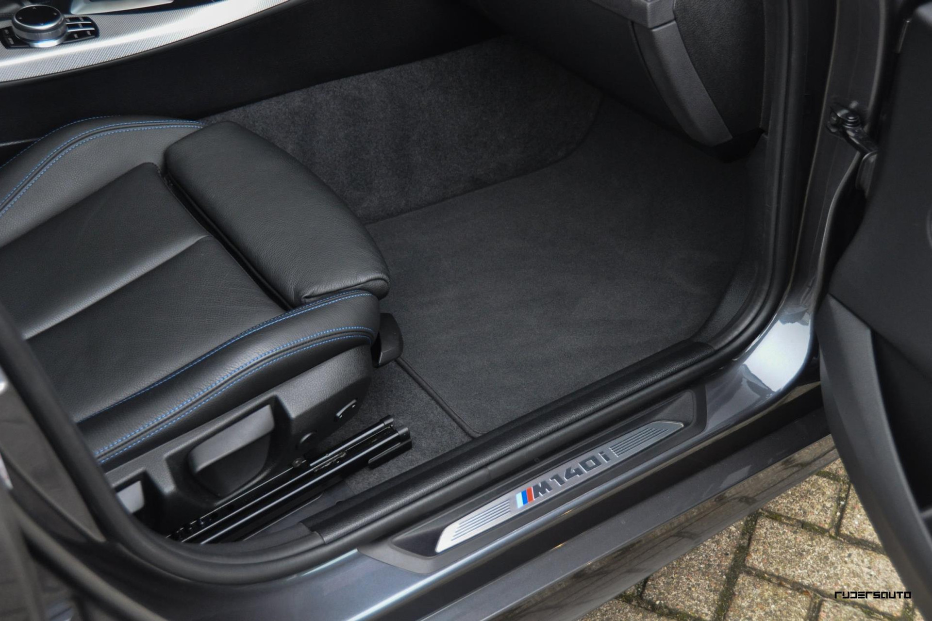 - Lederen sportstoelen met blauwe stiksels