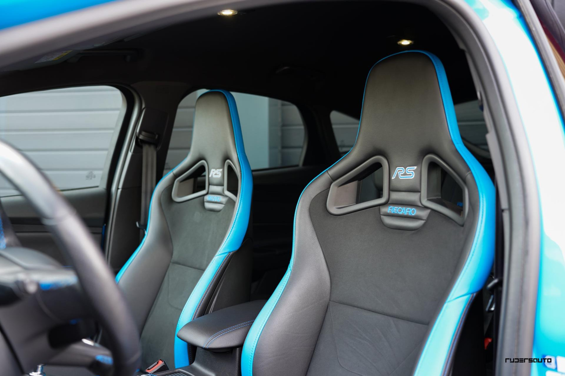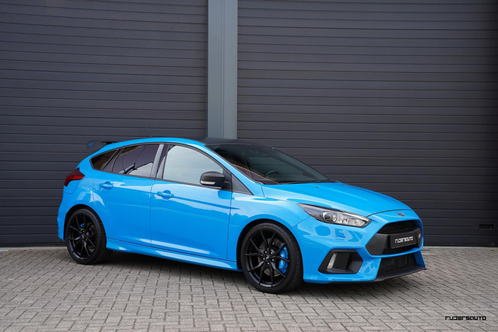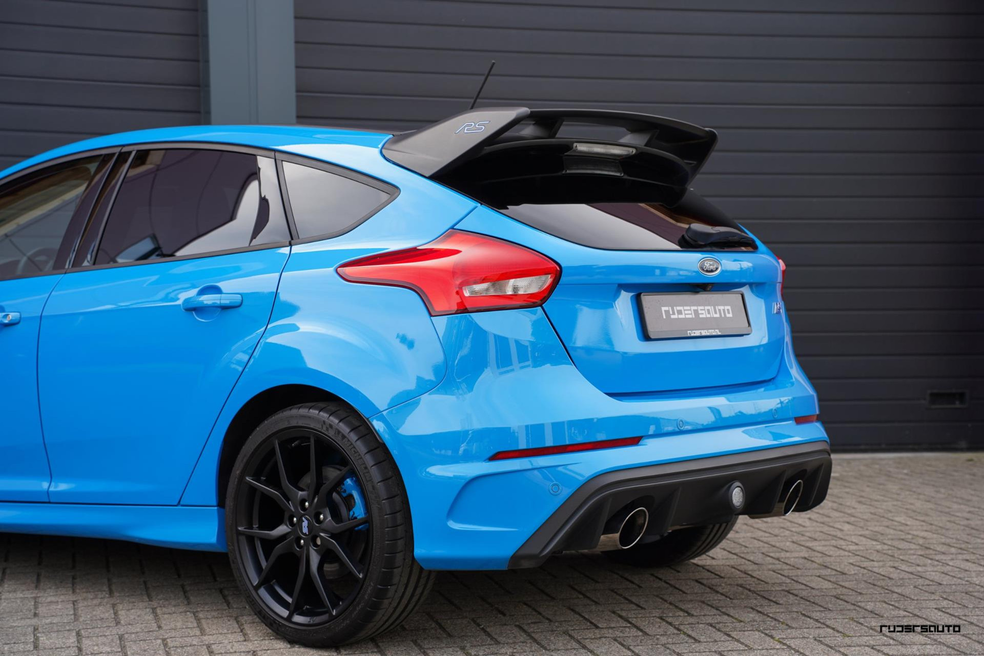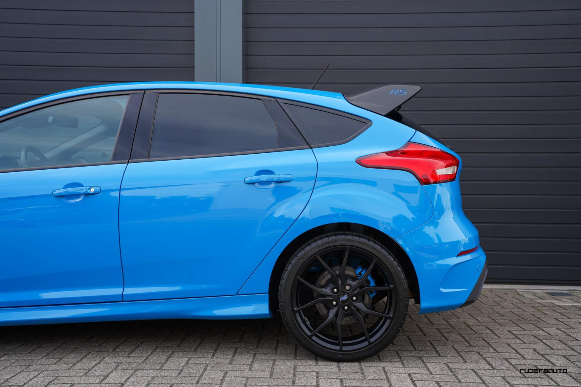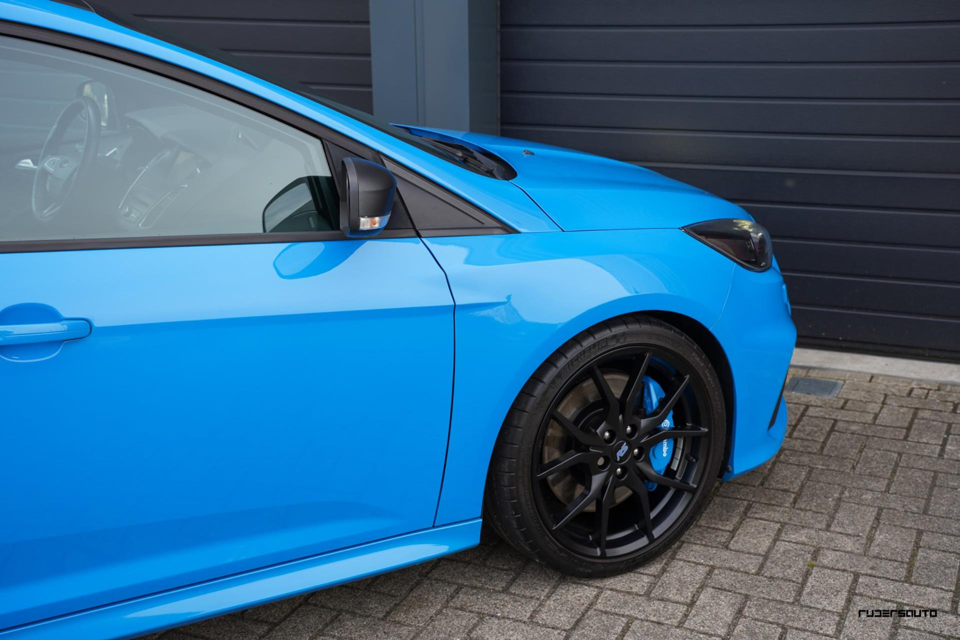 Je herkent de Blue & Black direct aan zijn matzwart/grijze dak, spoiler en spiegels, en in het interieur aan de tweekleurige Recaro-schaalstoelen. Daarnaast is deze Focus RS voorzien van gesmede en dus lichtere 19-inch matzwarte wielen.