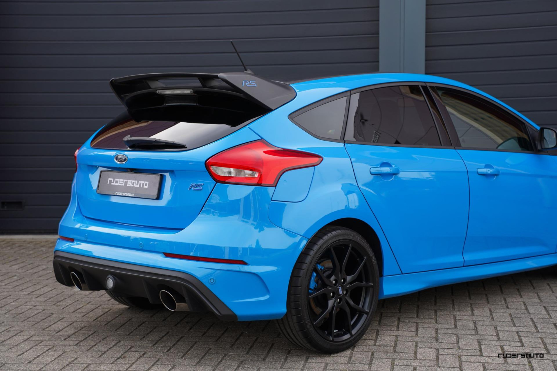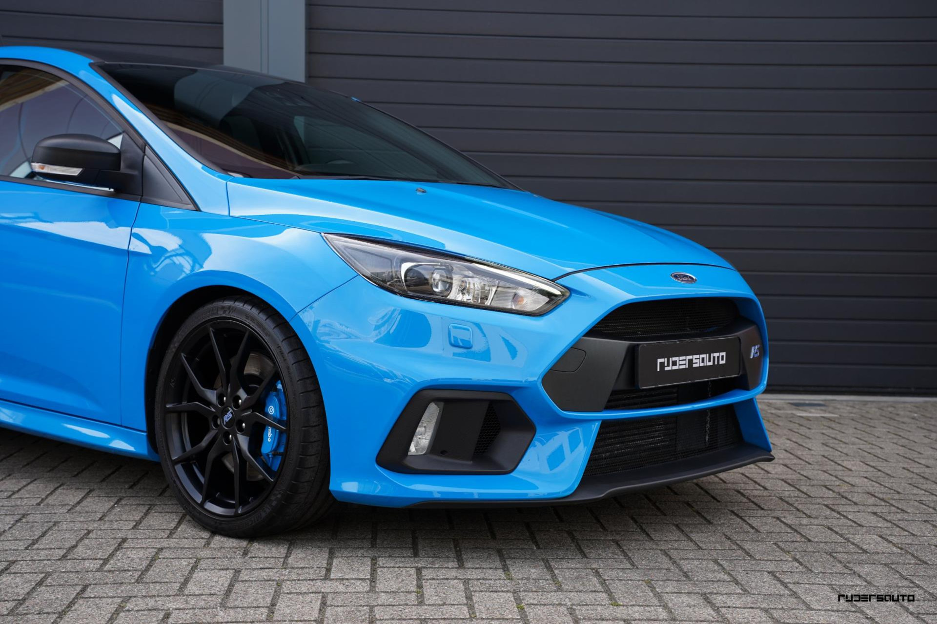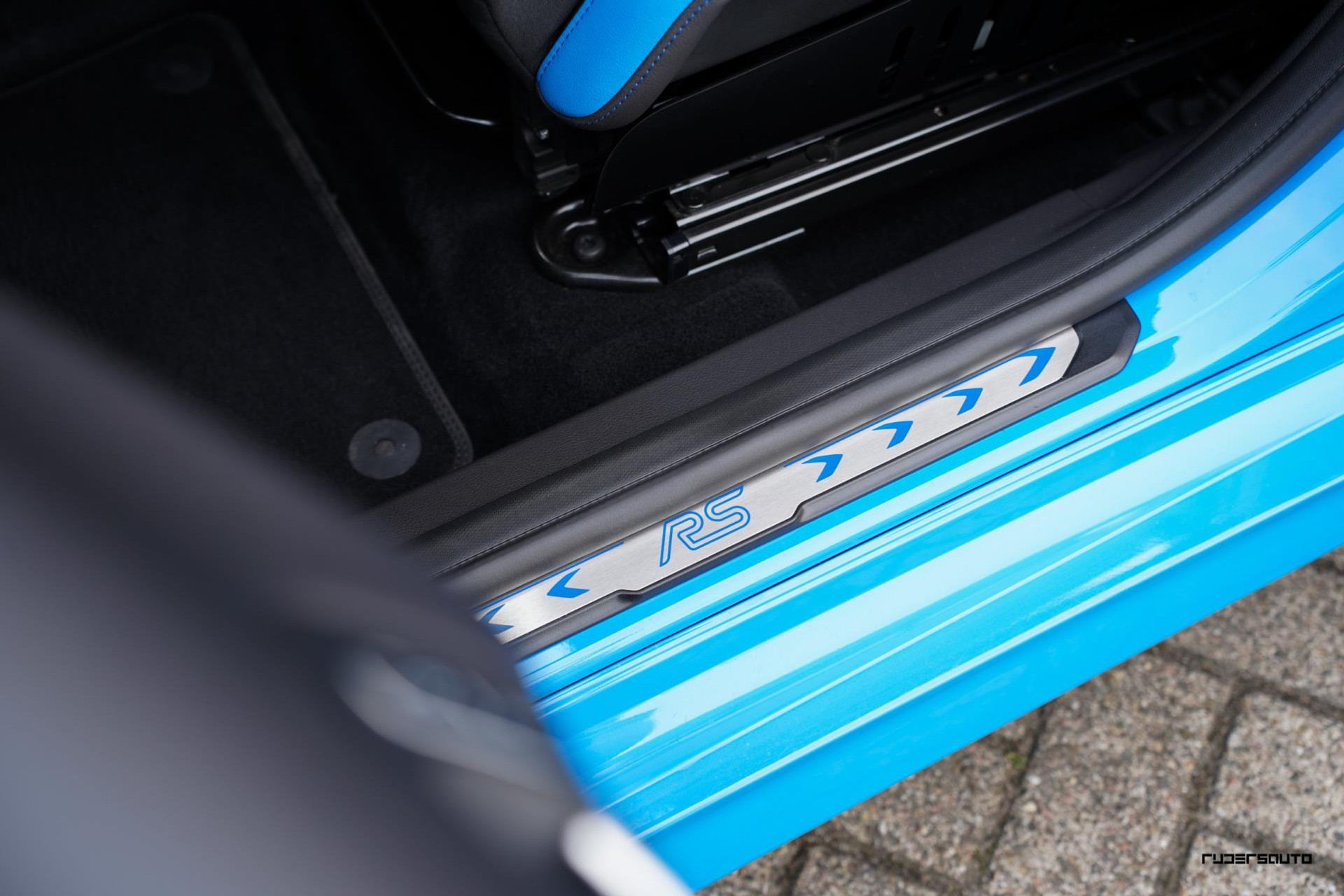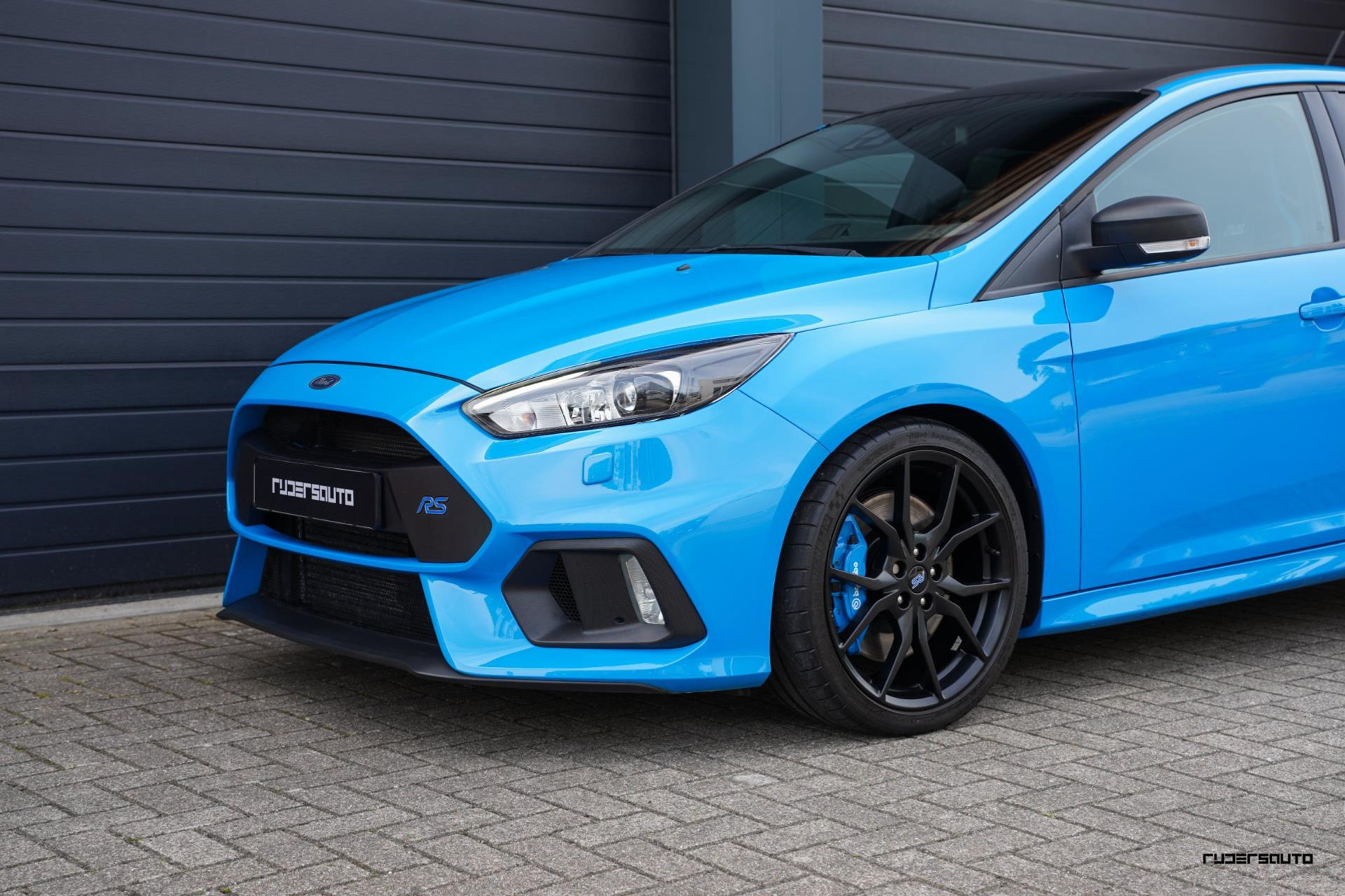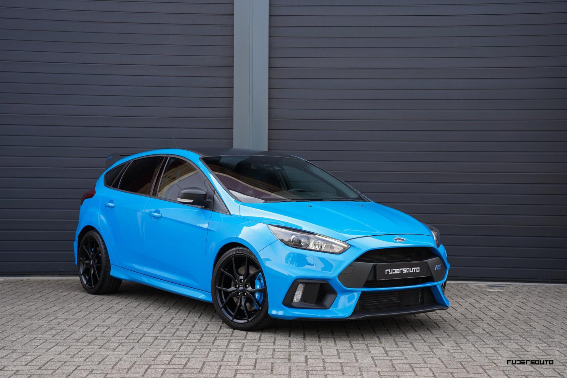 Je herkent de Blue & Black direct aan zijn matzwart/grijze dak, spoiler en spiegels, en in het interieur aan de tweekleurige Recaro-schaalstoelen. Daarnaast is deze Focus RS voorzien van gesmede en dus lichtere 19-inch matzwarte wielen.