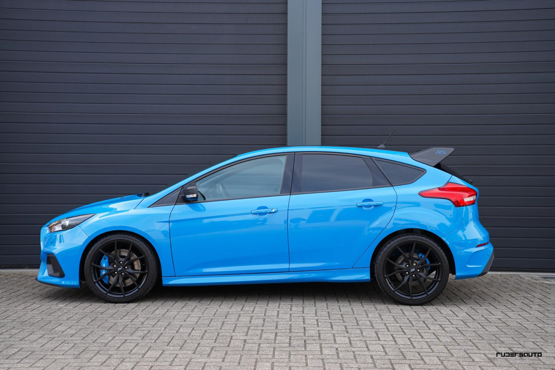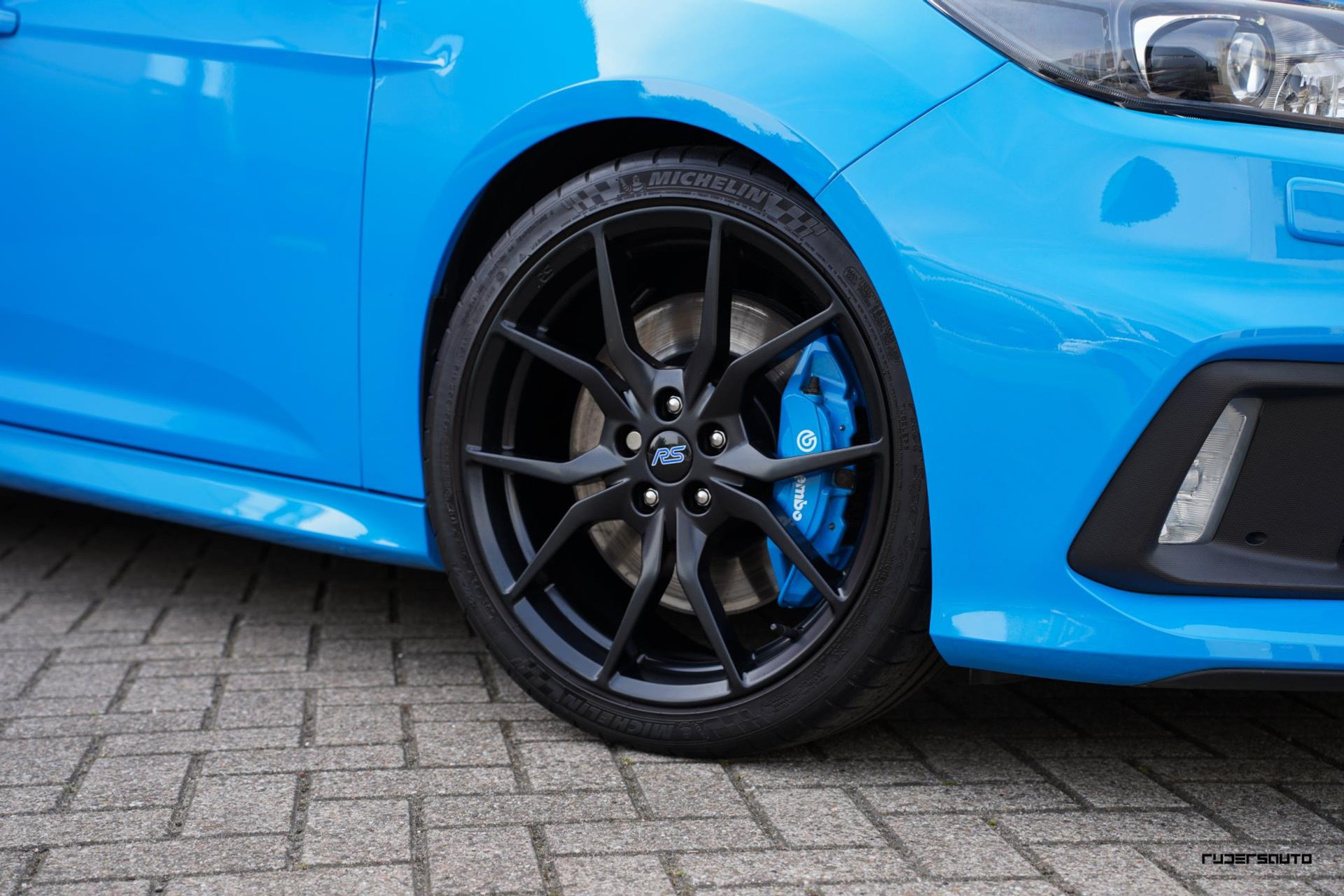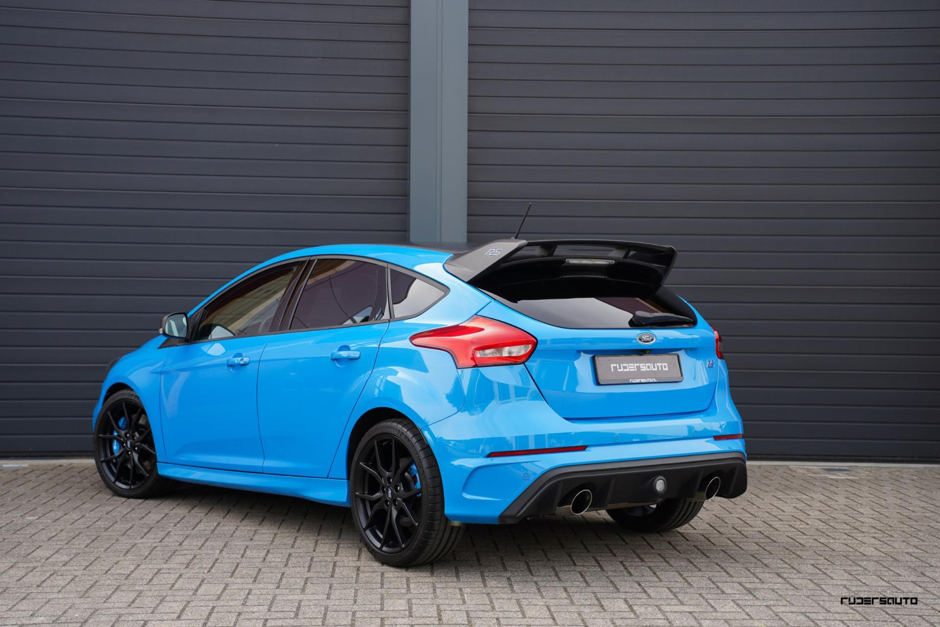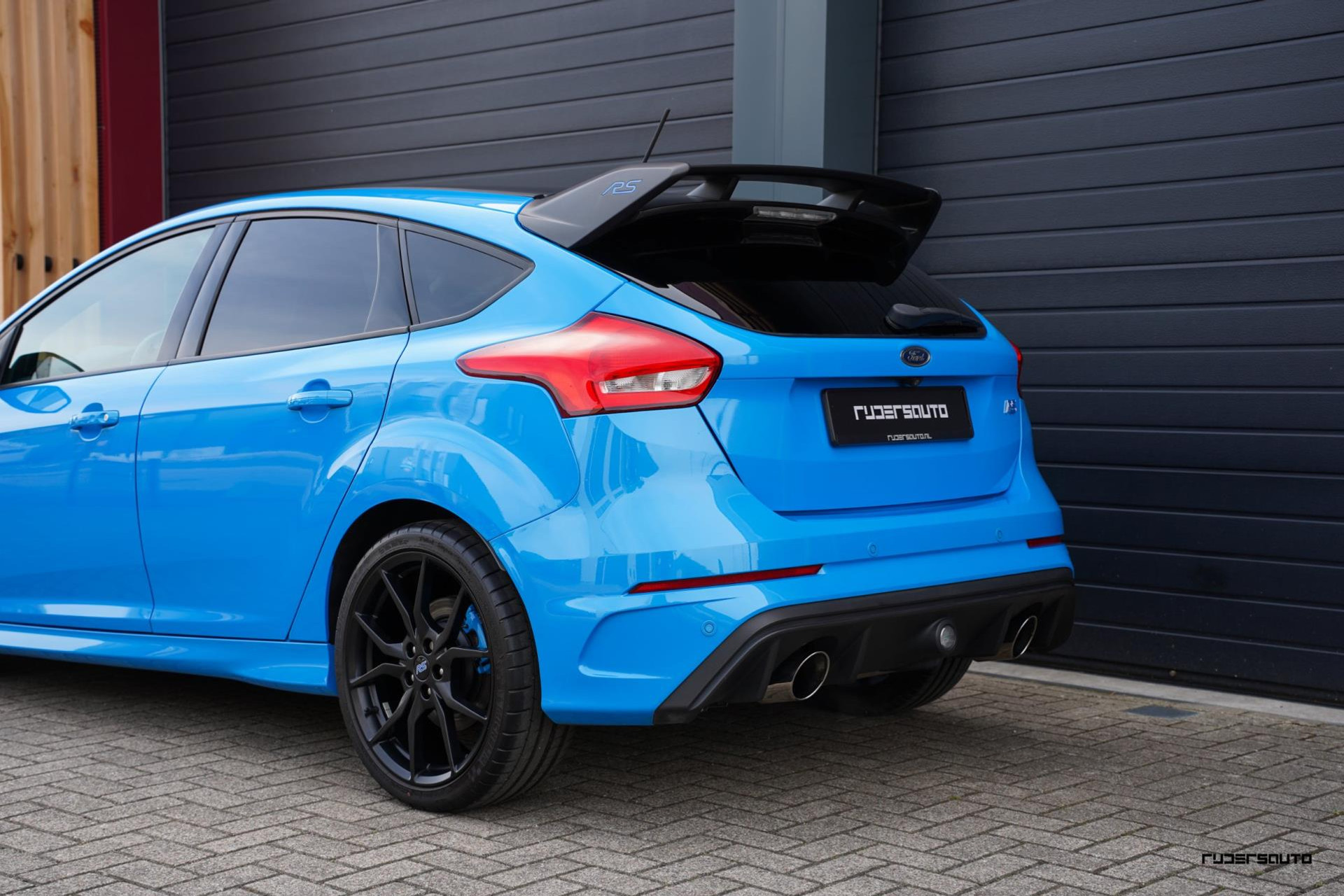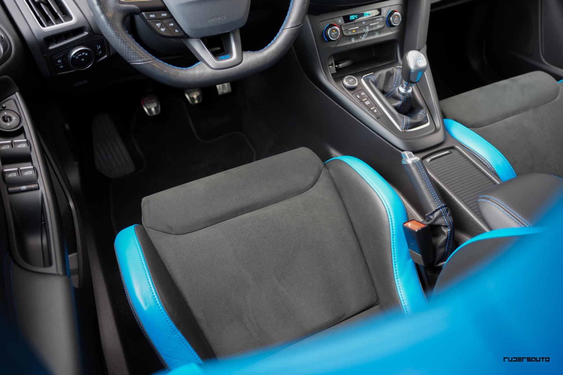 Je herkent de Blue & Black direct aan zijn matzwart/grijze dak, spoiler en spiegels, en in het interieur aan de tweekleurige Recaro-schaalstoelen. Daarnaast is deze Focus RS voorzien van gesmede en dus lichtere 19-inch matzwarte wielen.