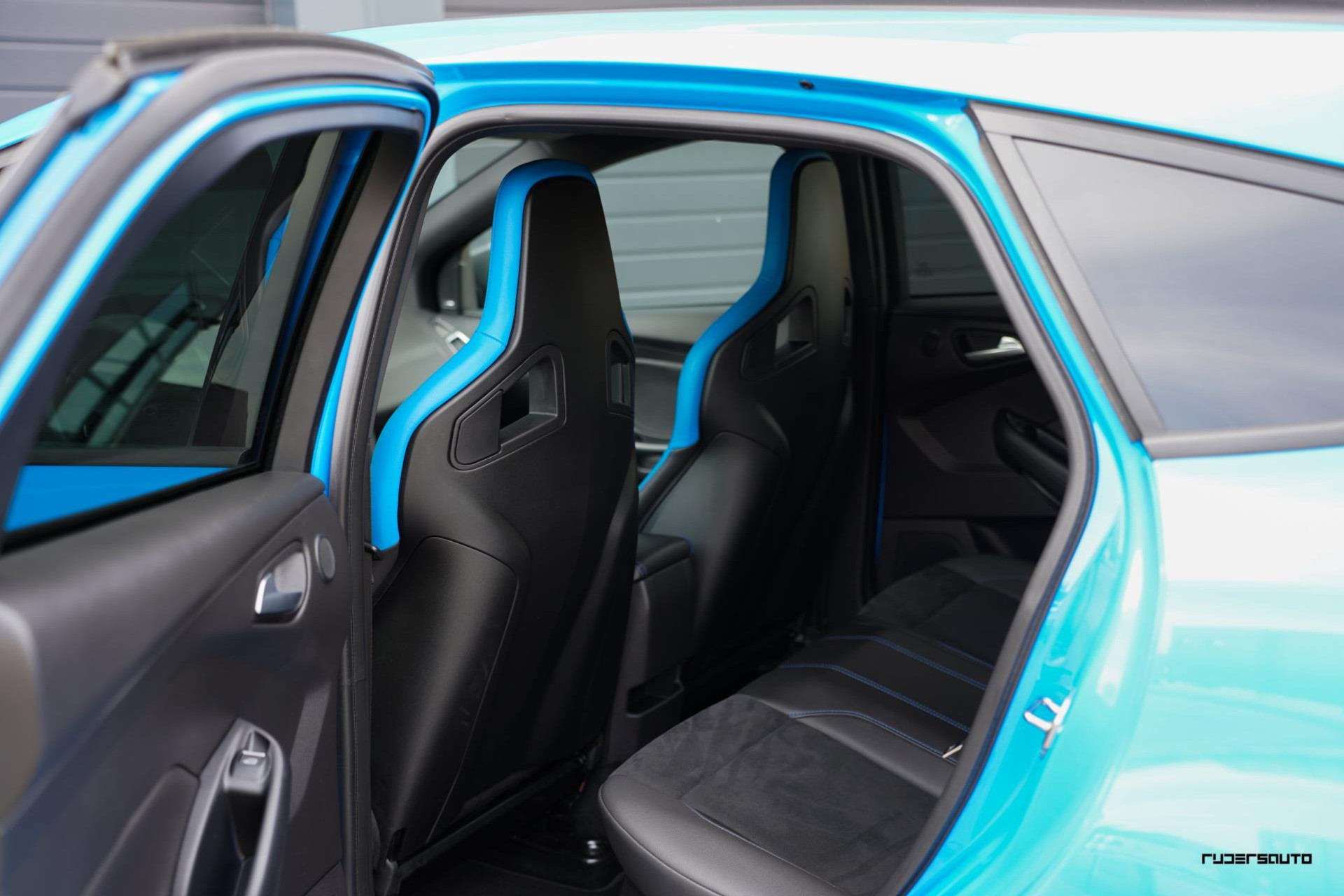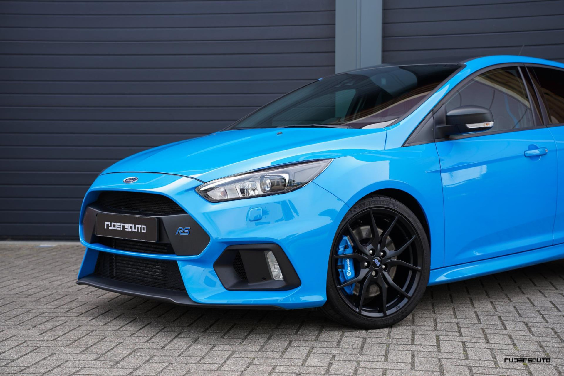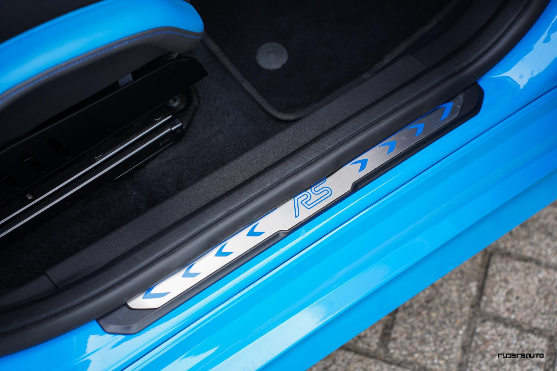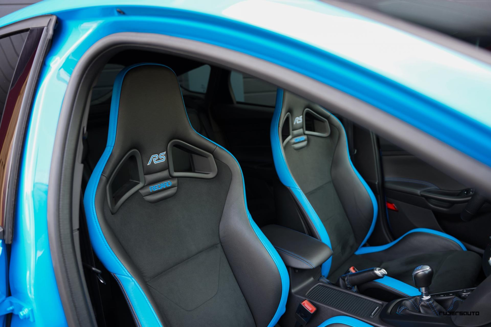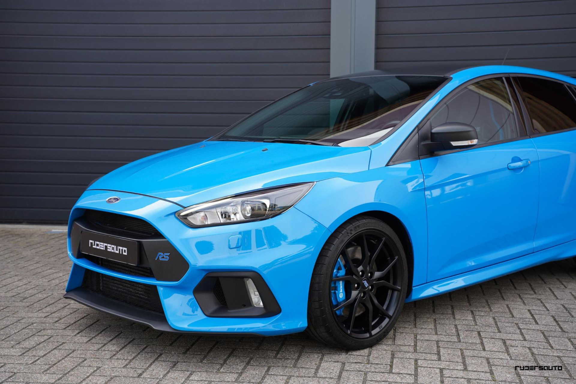 Je herkent de Blue & Black direct aan zijn matzwart/grijze dak, spoiler en spiegels, en in het interieur aan de tweekleurige Recaro-schaalstoelen. Daarnaast is deze Focus RS voorzien van gesmede en dus lichtere 19-inch matzwarte wielen.