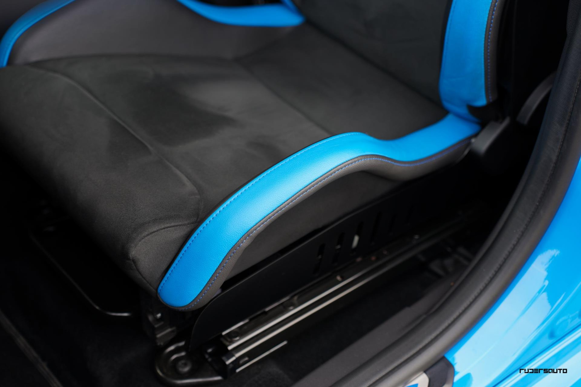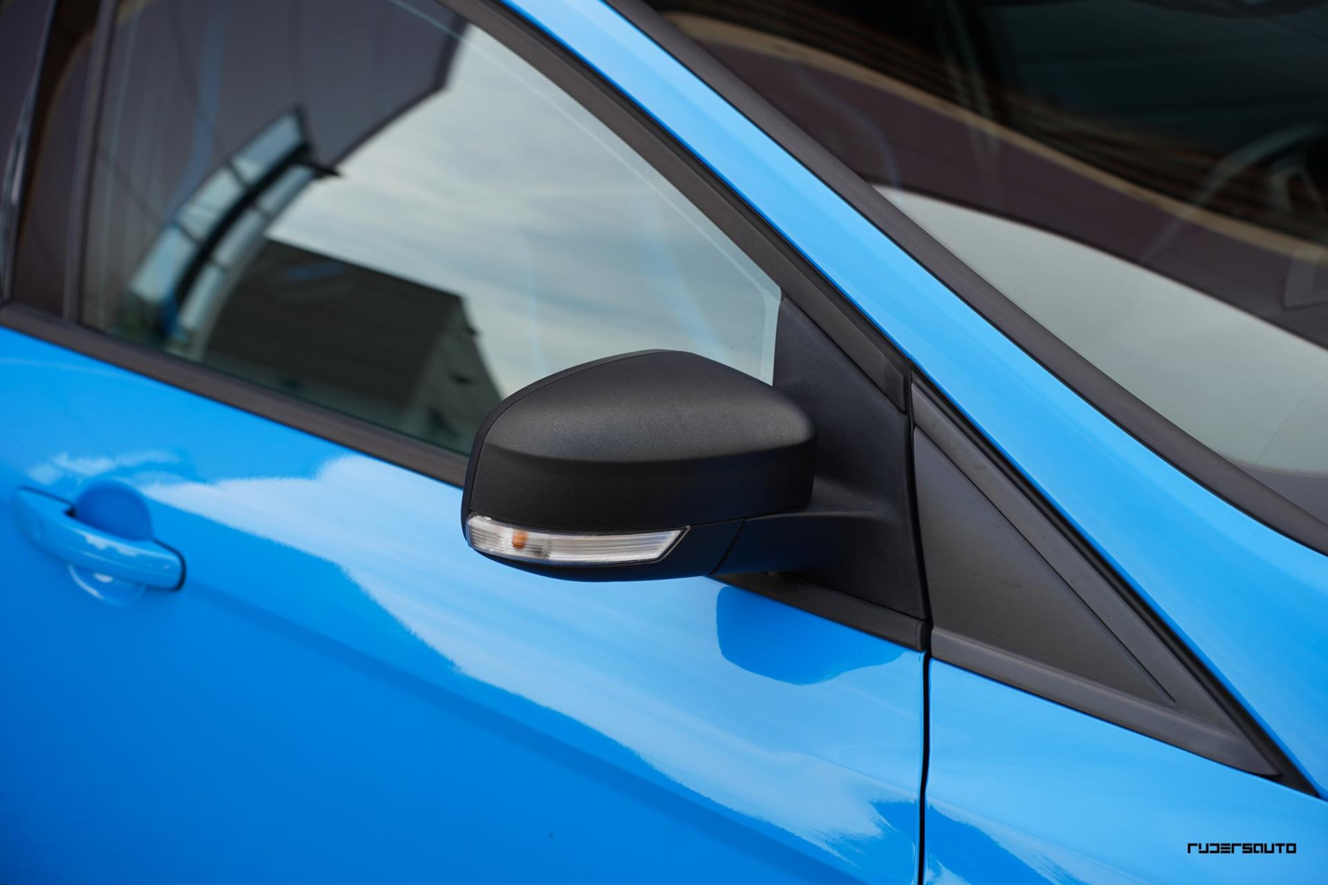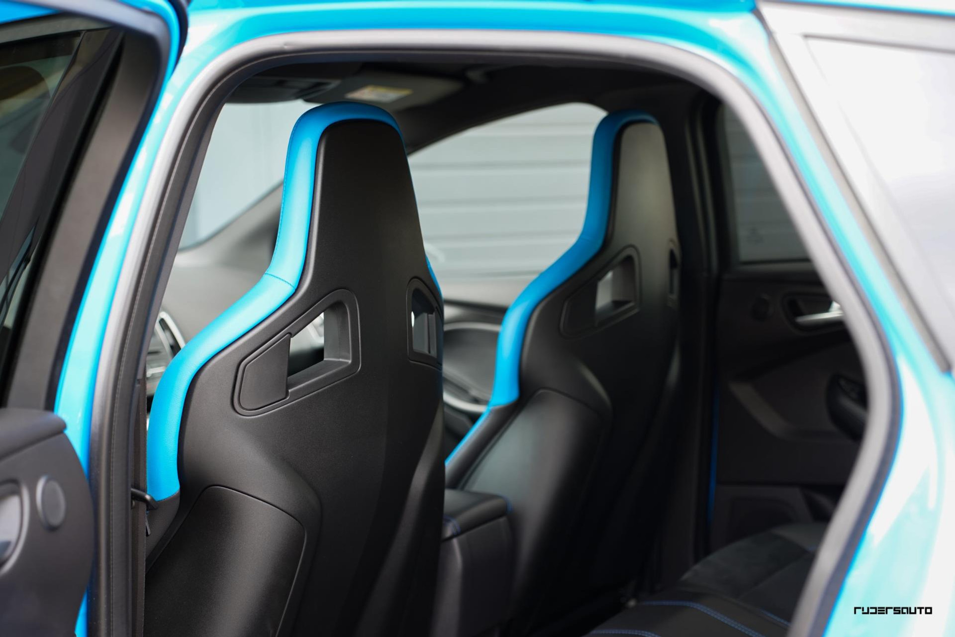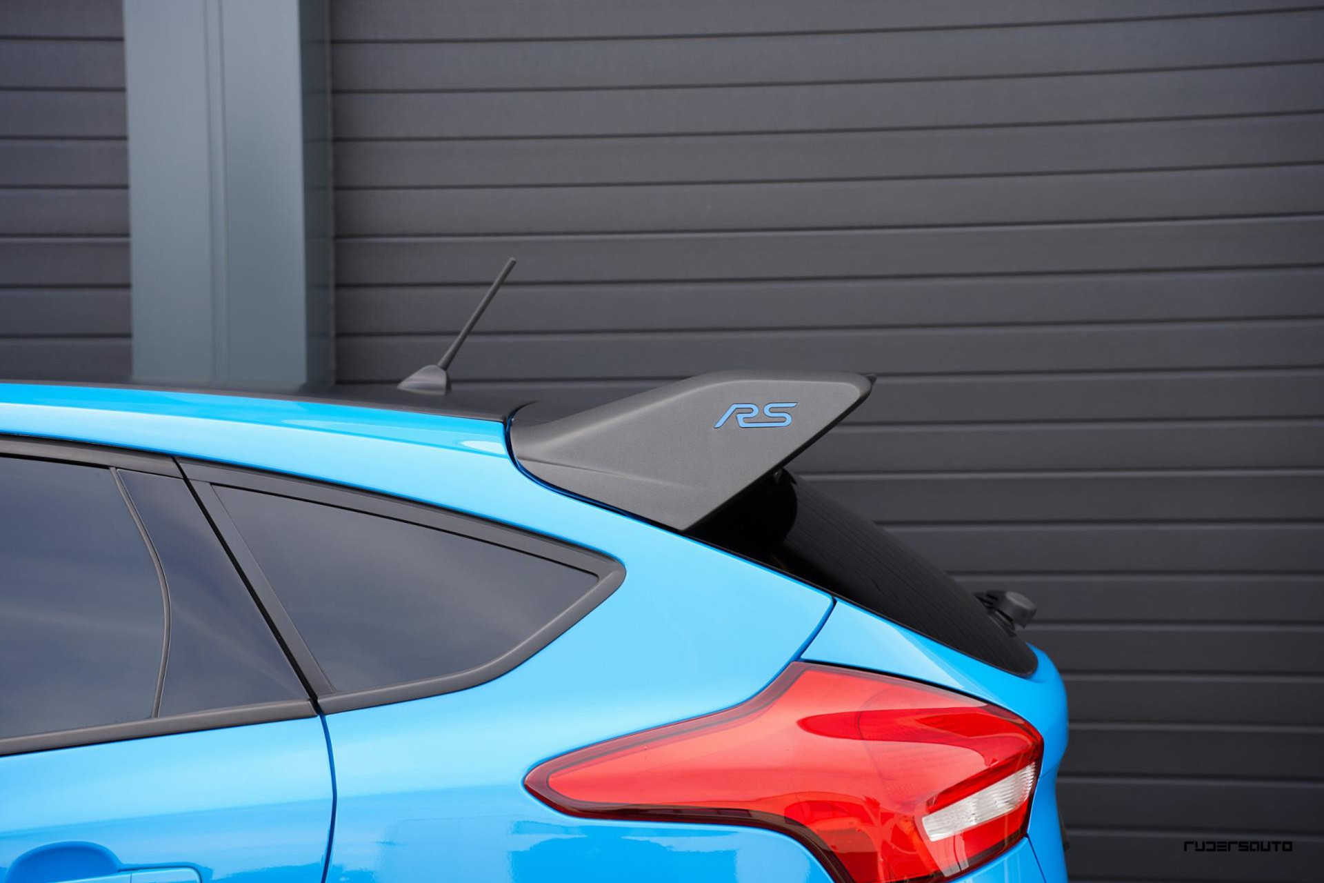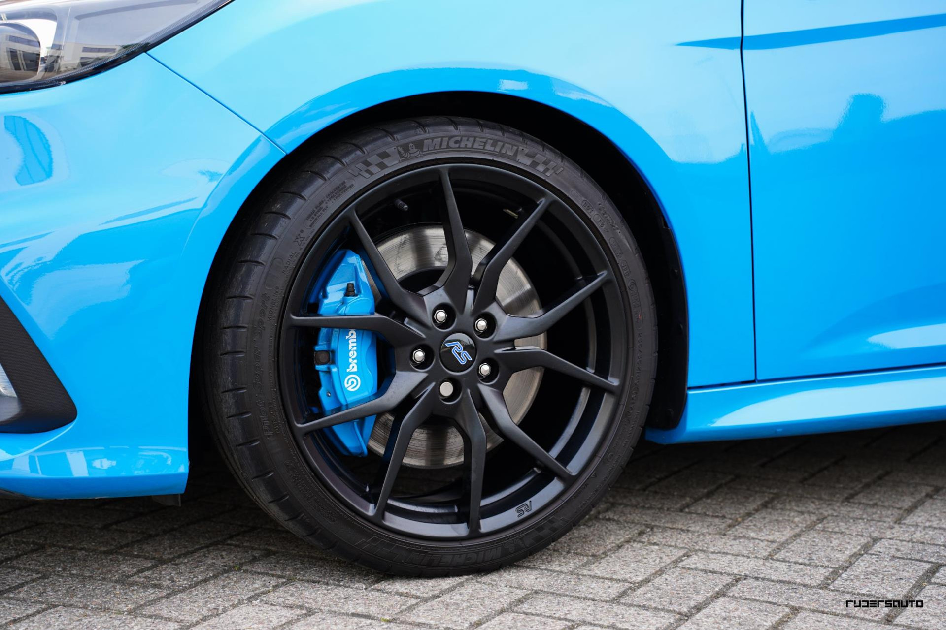 Je herkent de Blue & Black direct aan zijn matzwart/grijze dak, spoiler en spiegels, en in het interieur aan de tweekleurige Recaro-schaalstoelen. Daarnaast is deze Focus RS voorzien van gesmede en dus lichtere 19-inch matzwarte wielen.