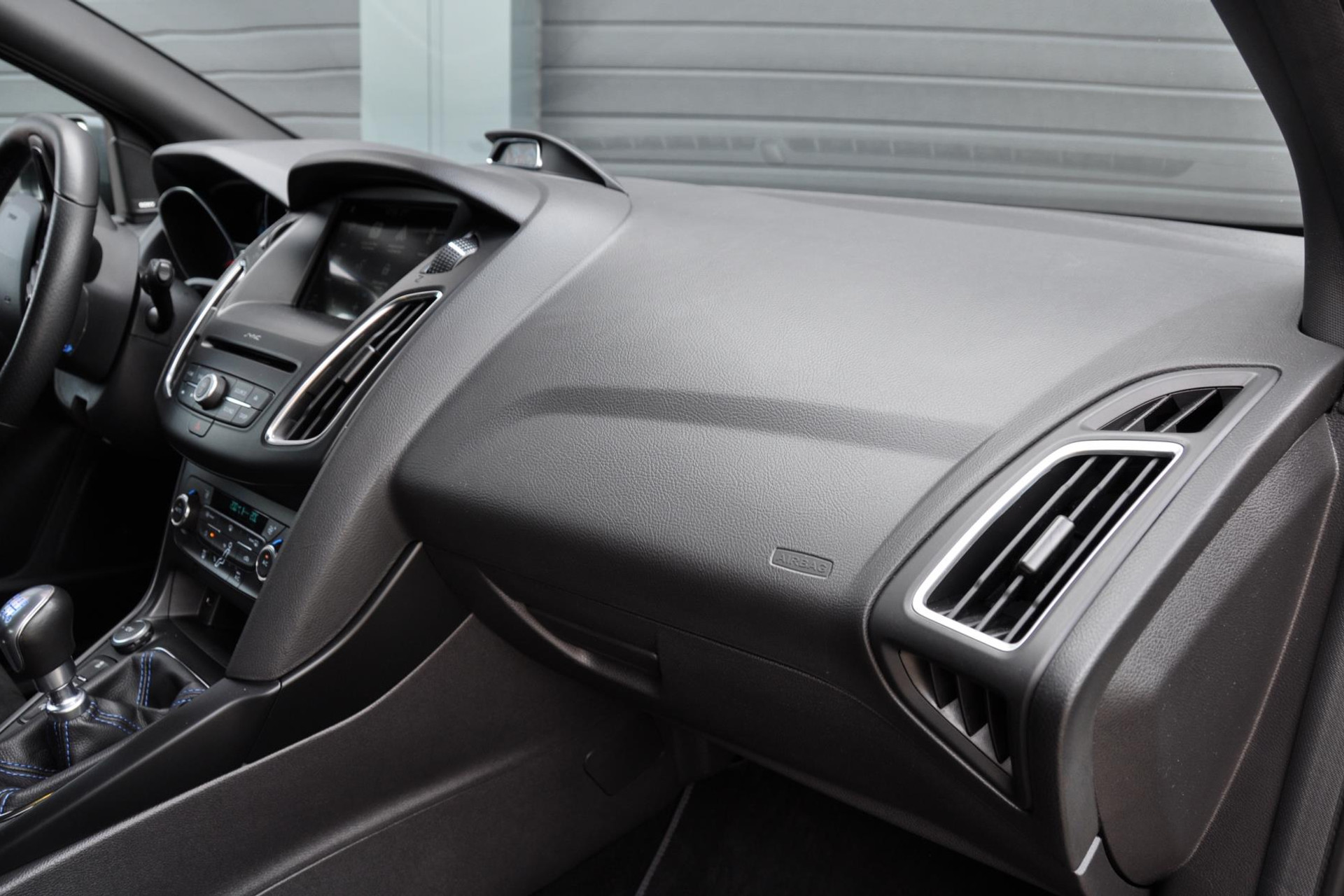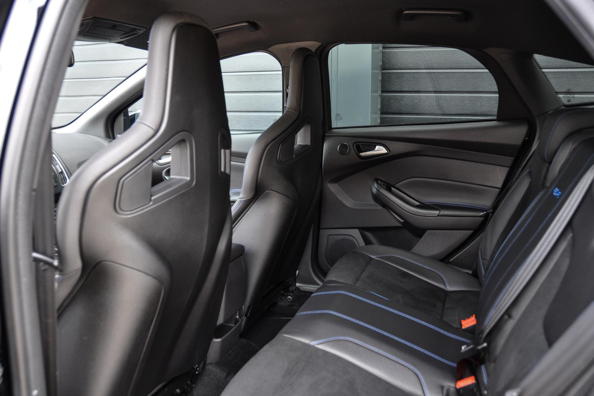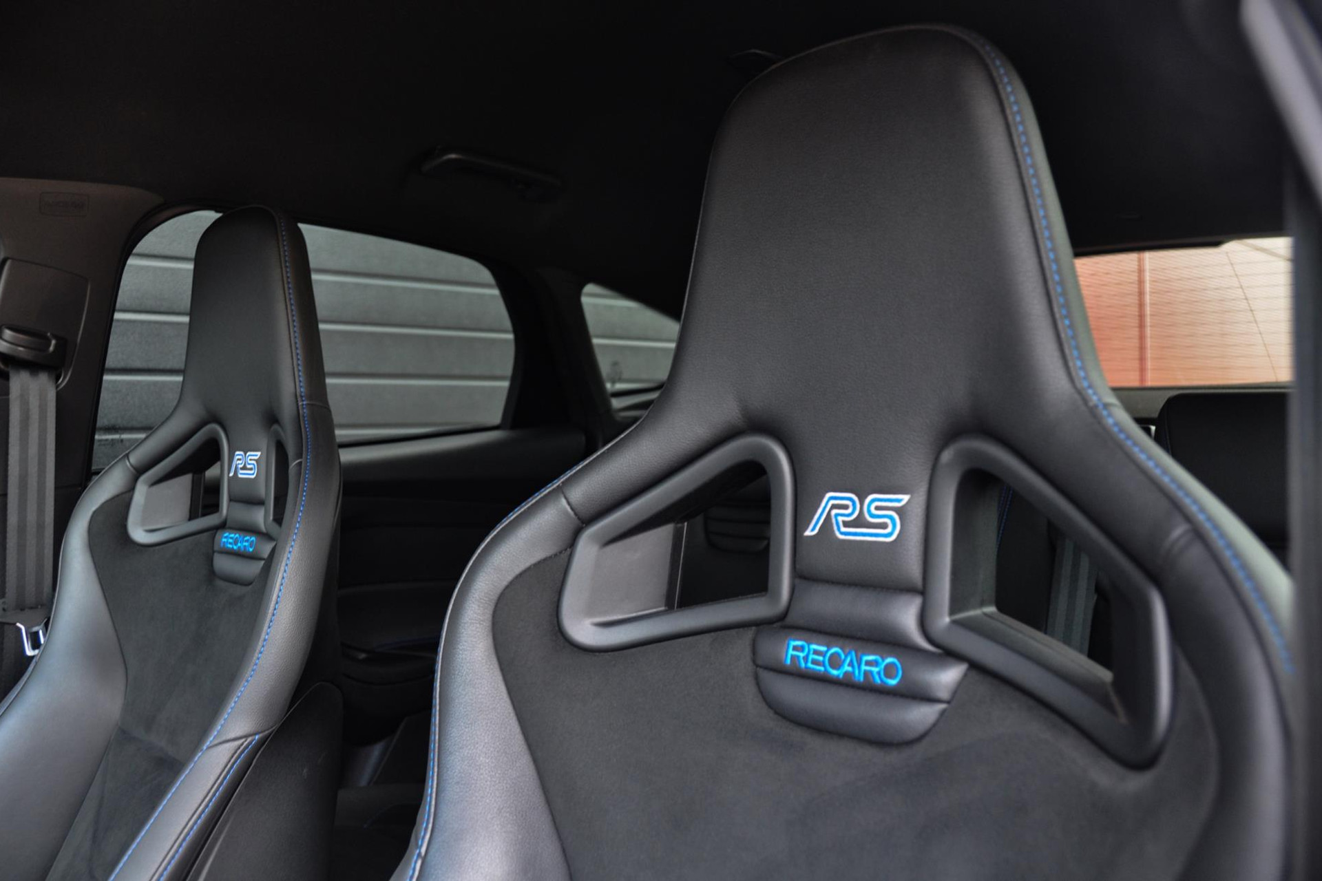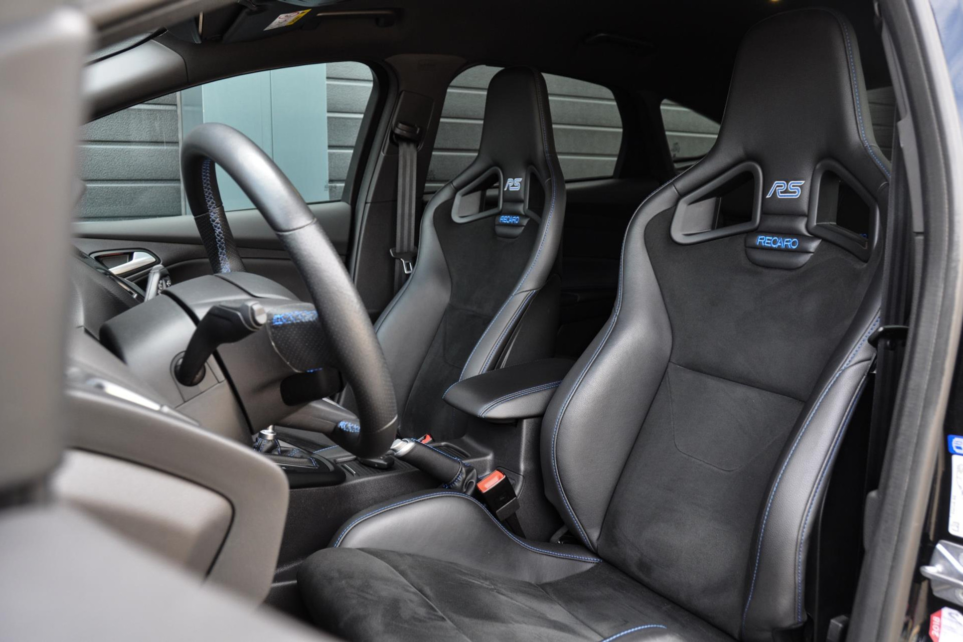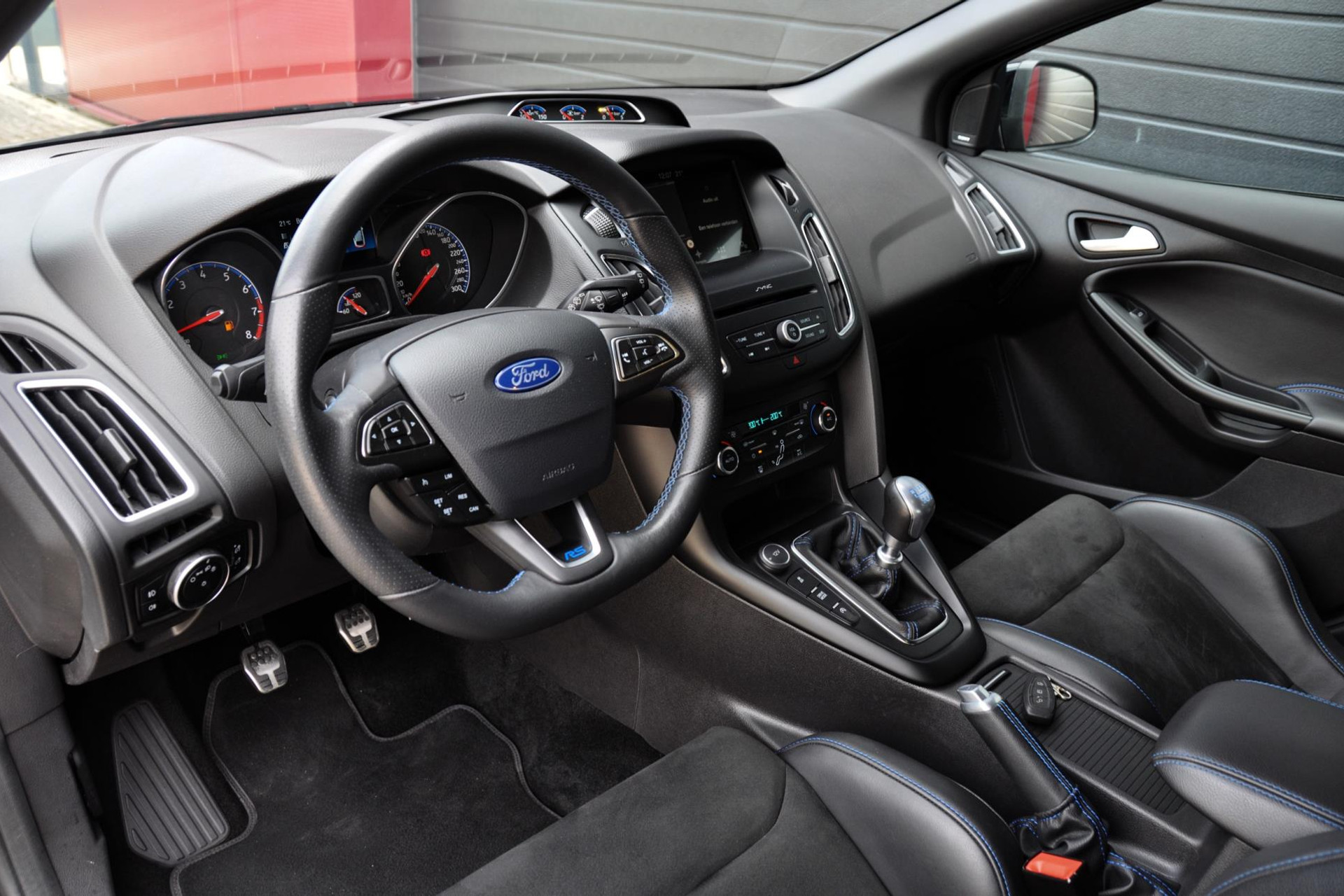 Ook is deze Focus RS voorzien van de gewilde Recaro schaalstoelen van leder en alcantara en afgewerkt met blauw stiksels. Deze blauwe stiksels vind je overal subtiel in het interieur terug, op de deurpanelen, het stuur, versnellingspook en ga zo maar door.